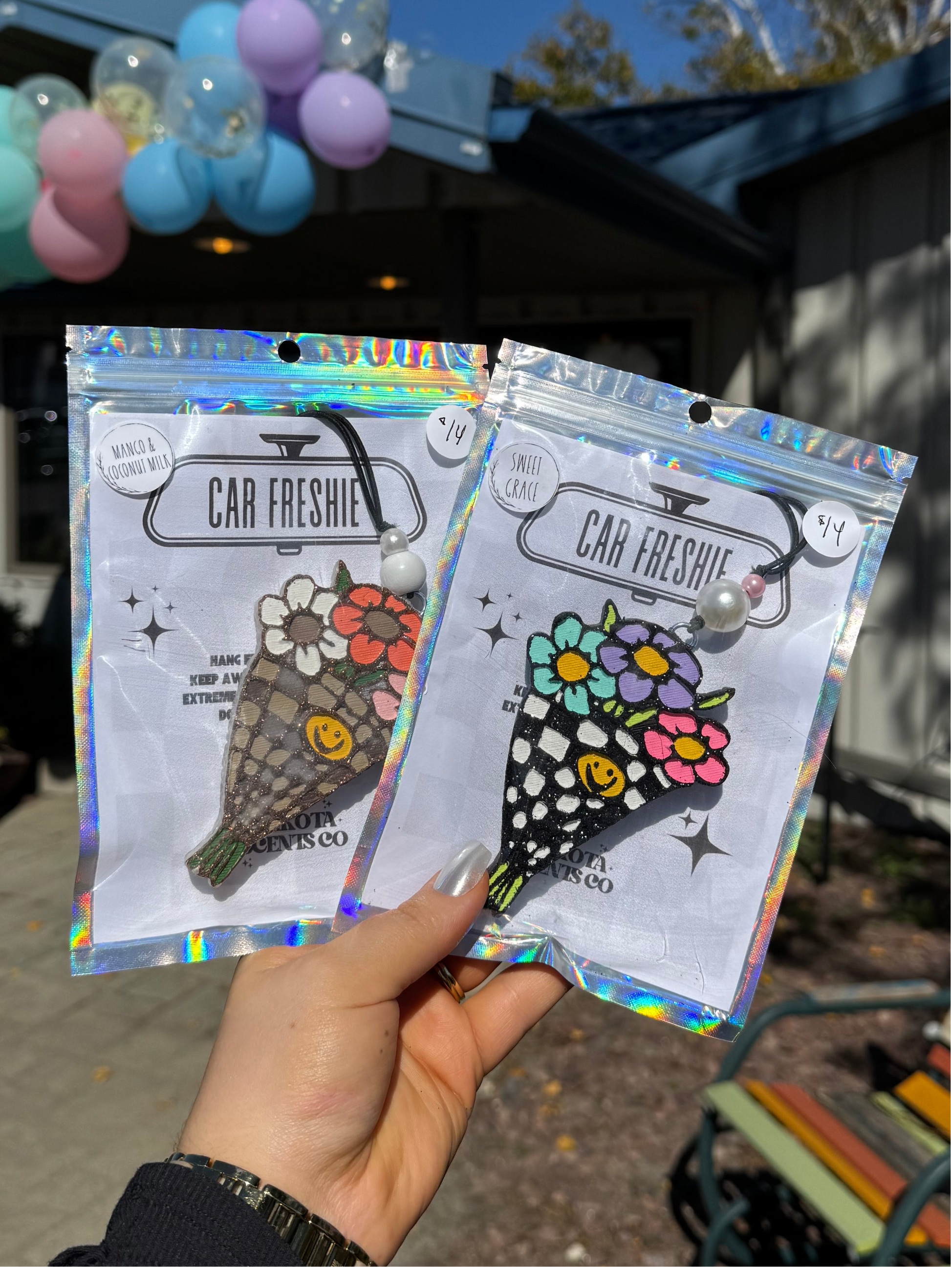 These car freshies are made to hang from your rear view mirror in your vehicle but can also be used in many places such as a closet, drawer, bathroom, locker, you name it! They normally last 3-7 weeks but some scents are stronger than others and can vary depending on your climate. Keep in mind that in hotter months, these may not keep their scent as long, due to the sun drawing out the scent faster. I use premium aroma beads and fragrance oils only. These are great as presents for any occasion or just to treat yourself! All of my car freshies are packaged in a sealed holographic foil pouch that’s durable, eco-friendly, and waterproof
